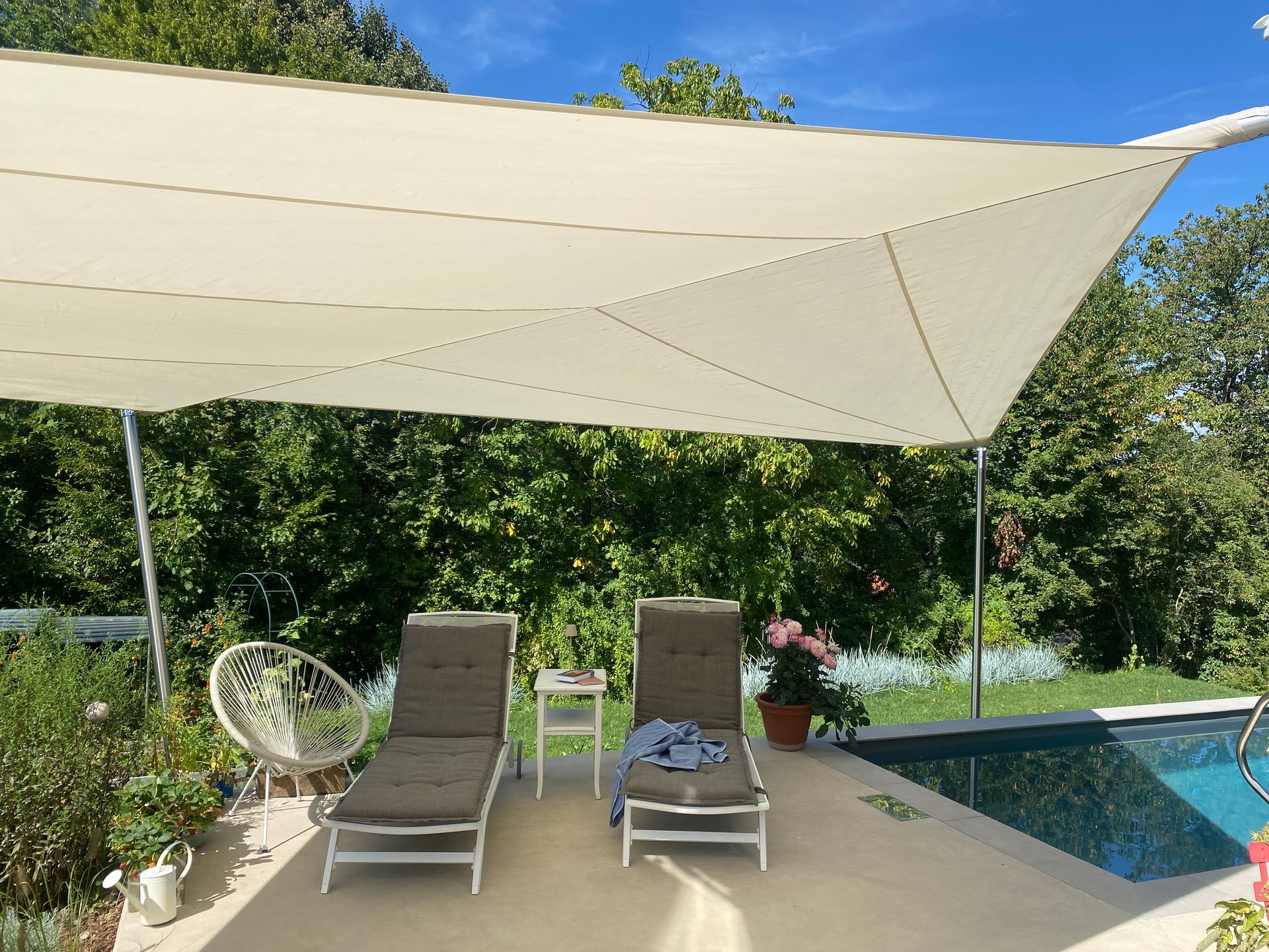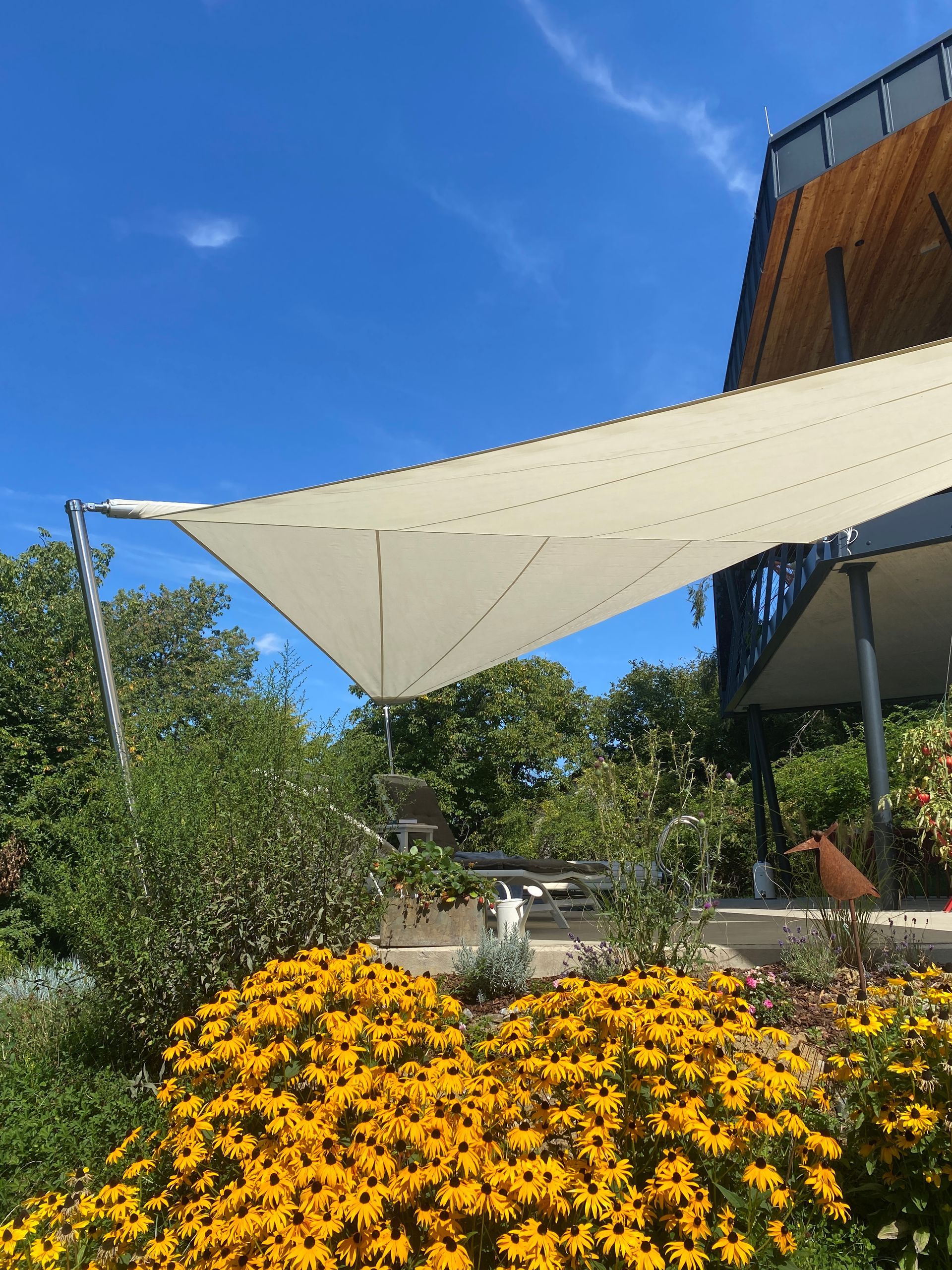 Die Art der Formgebung, Material, Farbe, Größe und Neigung geben jedem Sonnensegel seinen einzigartigen Look.