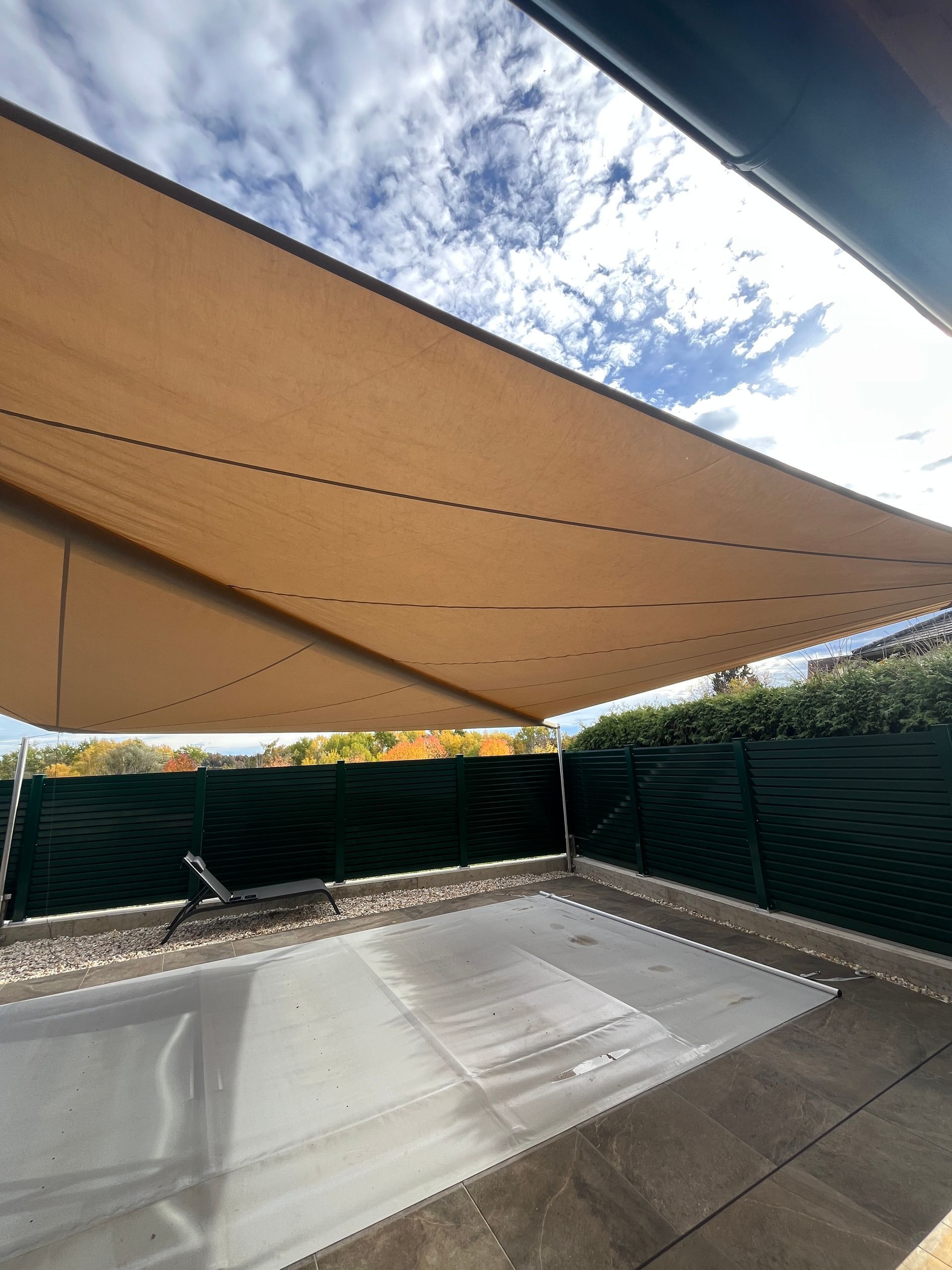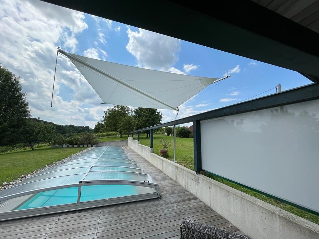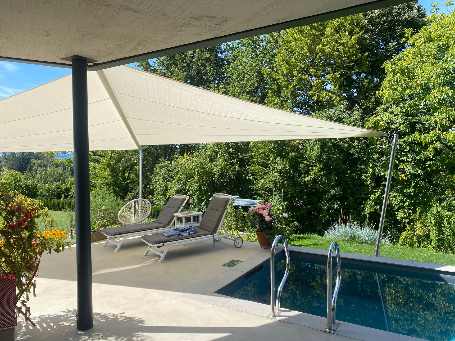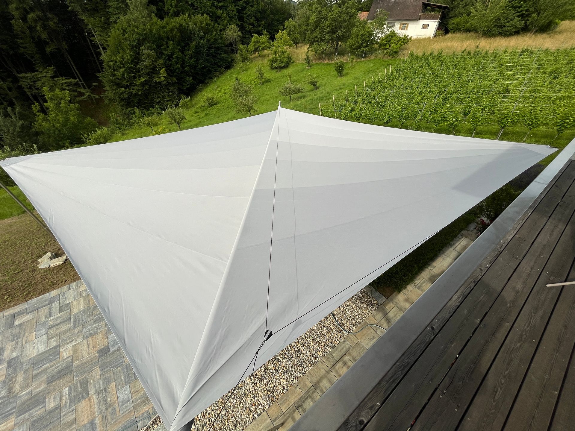 Sonnensegels."Klare Formen - moderne Linien - praktisches Design.Die Art der Formgebung, Material, Farbe, Größe und Neigung geben jedem Sonnensegel seinen einzigartigen Look.Jedes Sonnensegel-System wird individuell an die Architektur angepasst bzw. kann dieses auch gänzlich freistehend an jedem beliebigen Ort installiert werden.